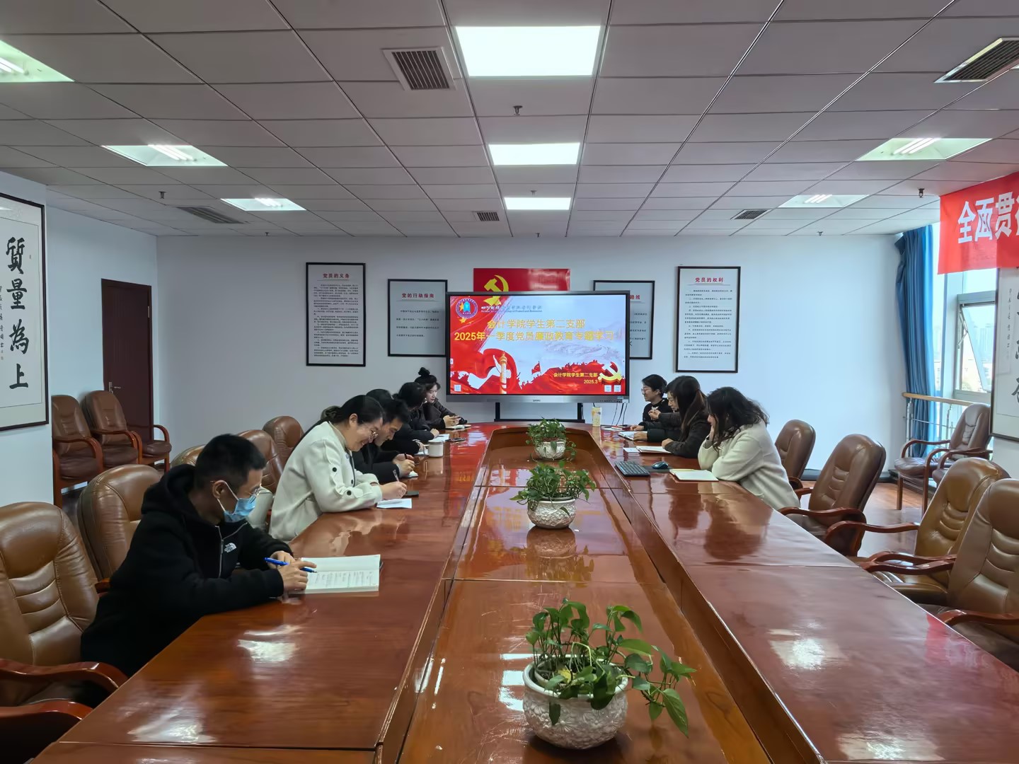 为贯彻落实全面从严治党和党风廉政建设要求,持续加强廉政教育,结合学院工作安排,2025年3月20日,会计学院学生第二党支部于明德楼613开展廉政教育专题学习,会议由支部纪检委员吴雪琴同志主持,学生第二党支部全体教师党员参加。