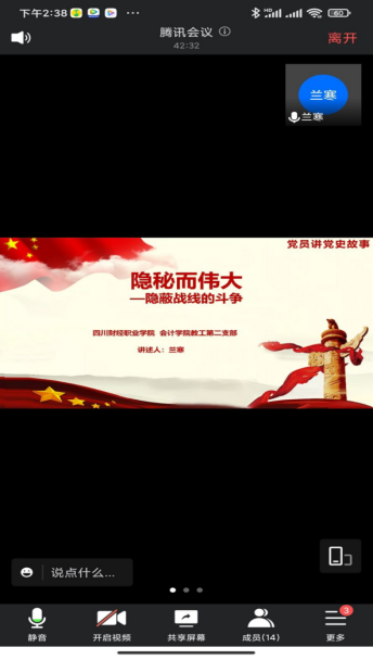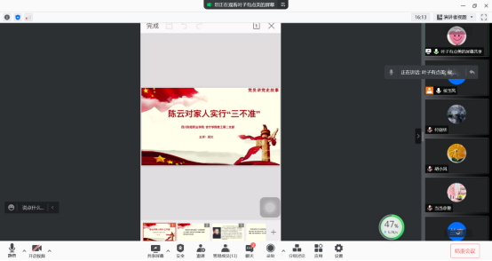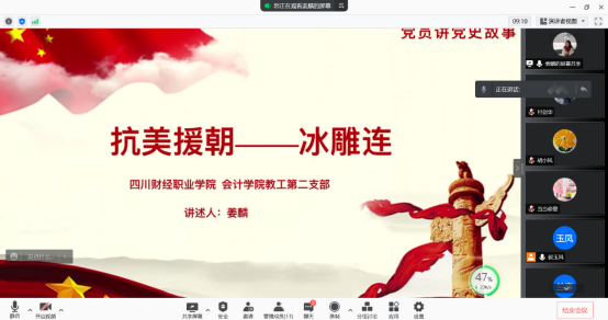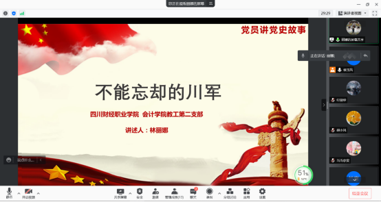 2021年11月16日,会计学院教工第二党支部用腾讯会议平台开展第二轮人人讲党史活动。此次活动由教工第二党支部支委侯玉凤同志主持,支部全体党员参加了活动。