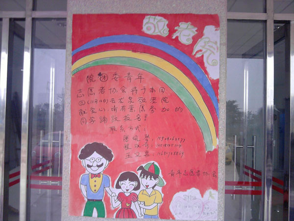 2009年11月17日院团委青年志愿者协会一行30名志愿者来到龙泉街道敬老院,进行志愿者活动。效果良好,得到社会各界的好评。