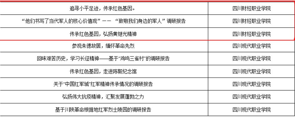 在这次的“挑战杯”国赛与省赛中,由团委组织、推荐,各学院共同指导、长期打磨的比赛项目取得了突破性成绩:在四川省正赛赛道中,《数字经济背景下O2O新型养老模式的构想研究》《新冠肺炎疫情对电子商务行业的影响研究》2个作品分别获评三等奖(会计学院、信息学院选送);在红色赛道中,《传承红色基因,弘扬三线精神》作品获评四川省二等奖(团委、信息学院选送) ,《追寻小平足迹,传承红色基因》《他们书写了当代军人的核心价值观——致敬我们身边的军人调研报告》《传承红色基因,弘扬黄继光精神》3个作品分别获评四川省三等奖(会计学院、工商学院、信息学院选送)。我院在红色赛道中获奖作品总数位居全省高职第二 ,二等奖是高职院校所获最高等级,一等奖、特等奖均为本科院校,获得二等奖的作品将参加“挑战杯”的红色专项活动路演展示。