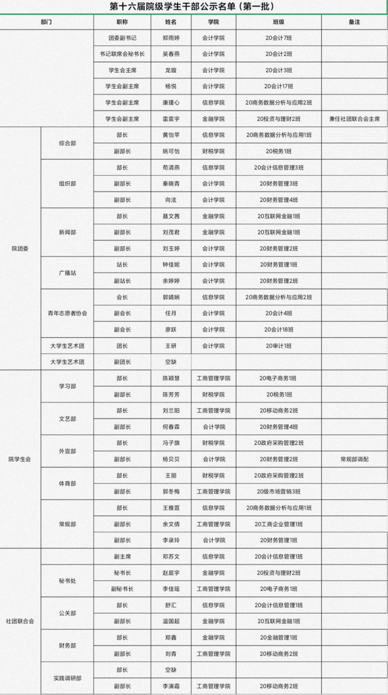 经过自愿报名,二级学院资格审核与推荐,本着公平公正公开的原则,学院各大学生机构进行了换届选拔,通过笔试,面试等环节,选拔出学院第十六届学生干部。现将第一批名单进行公示,公示期:6月22日-6月24日。如对公示的名单有异议,请于公示期向团委反映。