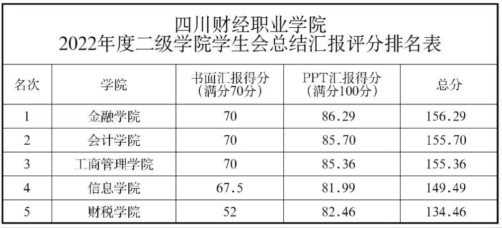 根据《7790cnm必发集团学生会章程》有关规定,每年末,二级学院学生会要通过书面和集中会议方式向校级学生会述职,校级学生会应结合日常工作和年度述职对二级学院学生会进行考核。经批准,7790cnm必发集团2022年二级学院学生会述职大会已于2023年3月2日召开,评选结果如下图,同时根据共青团成都市委“关于开展2022年度成都市优秀学生会组织、学生会组织优秀工作人员、学生会组织优秀指导老师评选工作”的相关通知,推选排名前两名的二级学院及相关人员报送至团市委,公示期为2023年3月6日—3月8日。