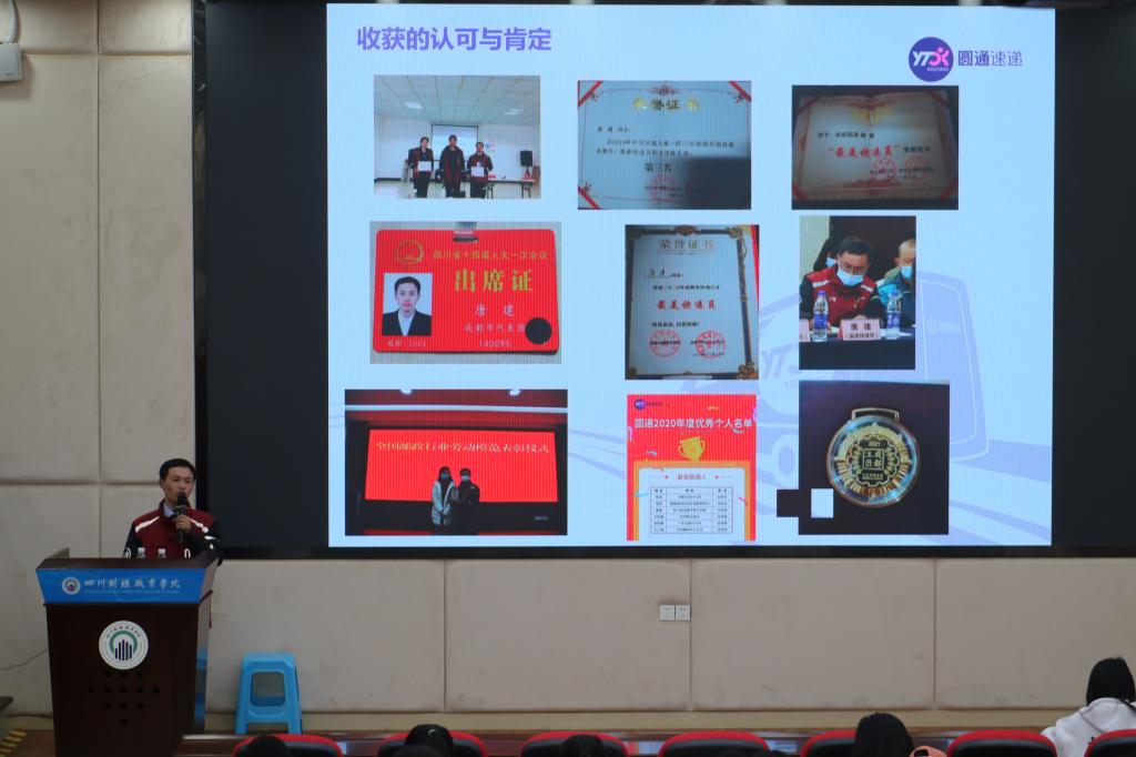 本次讲座特别邀请到四川省人大代表、全国感动交通年度人物、全国邮政行业劳动模范、成都工匠唐建老师。唐建老师以“不忘初心,我把青春献快递”为题,用朴实平凡的事迹向同学们详细讲述了自己的工作创业经历,从个人选择、团队建设、公益事业、创新精神方面开展分享交流。同学们从中获得了创业经验,了解到创业路的坎坷艰辛,也深切感受到唐建老师爱岗敬业、艰苦奋斗、勇于创新、坚持不懈的精神。