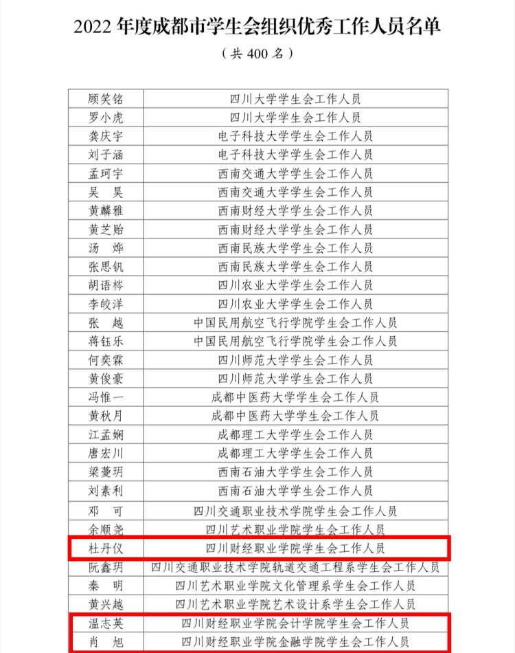 为继续加强团市委和市学联对学生会组织的指导管理,支持学生会组织更好地服务青年学生成长成才,充分发挥先进典型示范作用,进一步引导学生会组织参与和融入青年发展型城市建设。近日,成都团市委、市学联联合开展了2022年度成都市优秀学生会组织、成都市学生会组织优秀指导教师、成都市学生会组织优秀工作人员的评选工作。我校金融学院学生会荣获“成都市优秀学生会组织”称号;我校会计学院学生会指导老师张玮老师、金融学院学生会指导老师徐言老师荣获“成都市学生会组织优秀指导教师”称号;7790cnm必发集团学生会工作人员杜丹仪、金融学院学生会工作人员肖旭、会计学院学生会工作人员温志英三位同学荣获“成都市优秀学生会组织工作人员”称号。