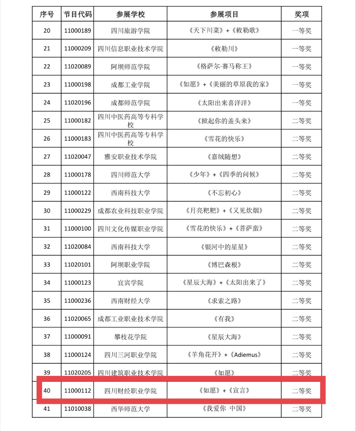 我院合唱队声乐作品“如愿+宣言”在四川省第十届艺术展演活动(声乐/甲组集体)荣获二等奖。