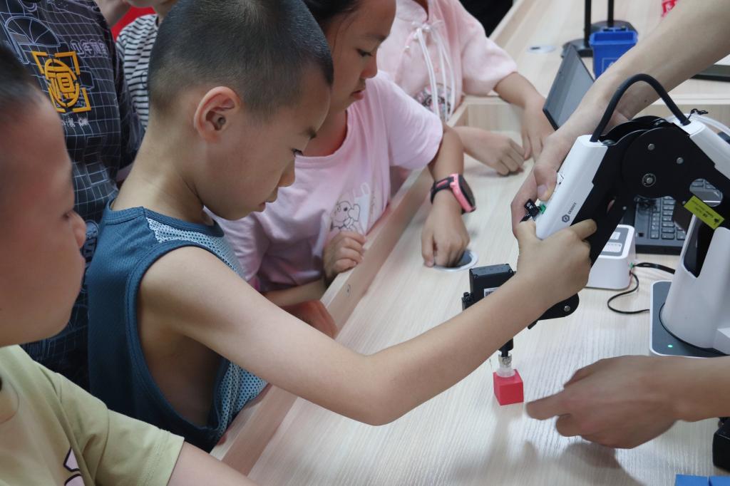 刘雪教师与实践团成员为孩子们准备了丰富多彩的科普内容。活动伊始,刘老师以生动的语言和有趣的动画向孩子们介绍了机械臂的工作原理及应用场景。他表示,编程正在改变世界,AI也变得越来越聪明,它可以让我们的生活变得更加便捷和美好。紧接着,孩子们通过自己在日常生活中的所见所学与老师进行了开心的交流与互动。最后在刘老师的带领之下,孩子们通过简易代码编程以及示教在线等方式,纷纷动手操作机械臂抓取物品,亲身体验到了编程的神奇与魅力,现场氛围十分热烈。