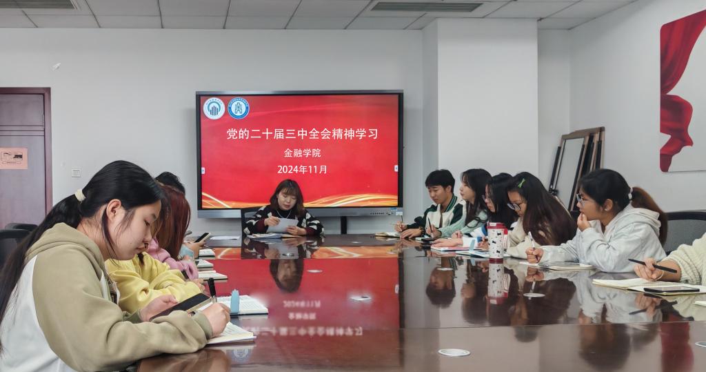 9、为深入贯彻学习党的二十届三中全会精神,11月8日,金融学院团总支学生会在徐言老师的带领下,在明德楼711进行了党的二十届三中全会精神学习。