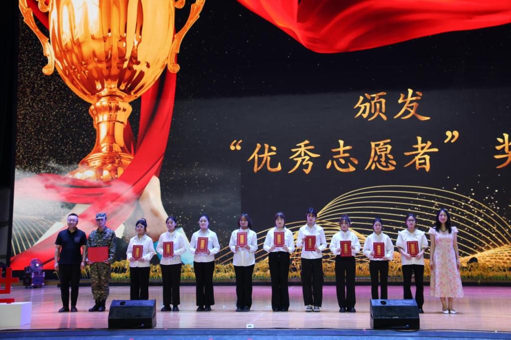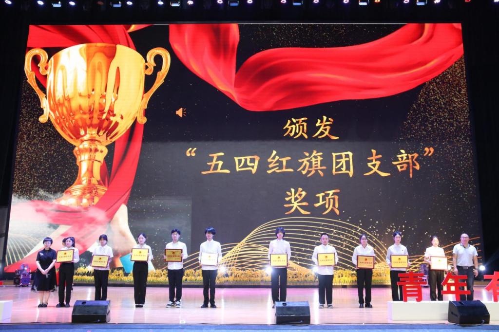 学院院长符刚宣读2025年“两红两优”表彰文件,学院领导及各部门负责人依次为“五四红旗团支部”“优秀团干部”“优秀团员”“优秀志愿者”“优秀社会实践个人”“优秀志愿服务团队”等校级获奖代表,以及“中华经典诵写”大赛、“挑战杯”创业计划大赛省级获奖团队,“全国高校活力社团”“全国大学生志愿服务优秀团队”等国家级获奖集体颁奖并合影留念。