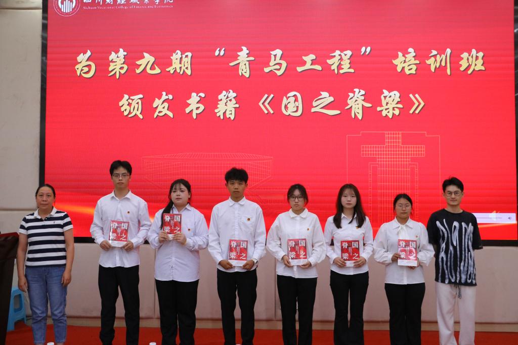 党委组织部副部长陈明珠,团委副书记肖松松为第九期“青马工程”培训班学员代表颁发书籍《国之脊梁》。