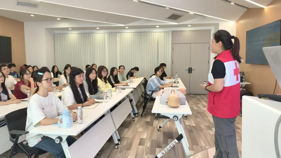 医疗急救课中,红十字会的庄静老师采用“理论知识讲解 + 人体模型实操”的方式,将心肺复苏、海姆立克急救法等应急技能一一展示。最后,还特别设置提问与答疑环节,方便志愿者对急救知识有更进一步的了解。