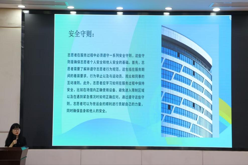 齐怀远老师从大型活动(赛会)志愿服务介绍、志愿者的定义、大型活动(赛会)志愿服务的一天、志愿服务行为规范这4个方面进行了生动有趣的讲解,让志愿者们了解了有关世运会与志愿者的知识,从中感受到了“我参与,我奉献,我快乐”的志愿者精神。