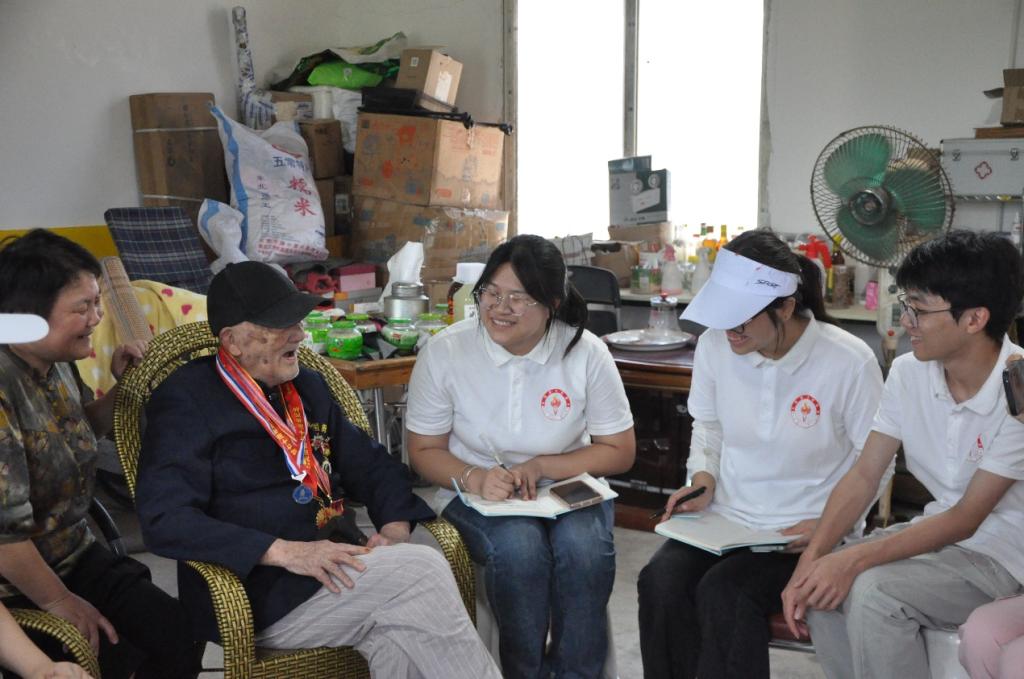 接着,实践团怀着崇敬之心拜访了向树成同志。向同志 1927 年生于泸县通滩乡,15 岁参军,负责搬运沉重的炮弹。他回忆道:“32 公斤重的美国炮弹,全靠我们徒手搬运,部队连鞋都不发,只能江边搓草绳打草鞋,手磨得通红。船不够就拦过路船,排成队接力传递炮弹。”1944 年春,战火逼近,他随部队开赴云南保山,用简陋武器抵御日军凶猛进攻。“一次夜袭,子弹擦着耳边飞过,现在想起来都心有余悸。” 战士们吃的是带壳的 “茄子米”,煮藤藤菜不见油星,在泥坑中一趴就是半天,许多人落下风湿。直到 1945 年日本投降,大家欢呼雀跃,泪水与笑容交织,那段浴血岁月,成为向同志永不磨灭的记忆。向同志说:“希望我们好好的,不想让后人再过一遍苦日子。” 这句质朴的话语,让实践团成员们深受触动,深刻感受到先辈们对和平生活的珍视与期盼,他们深知如今的和平来之不易,是无数先辈用生命和鲜血换来的。