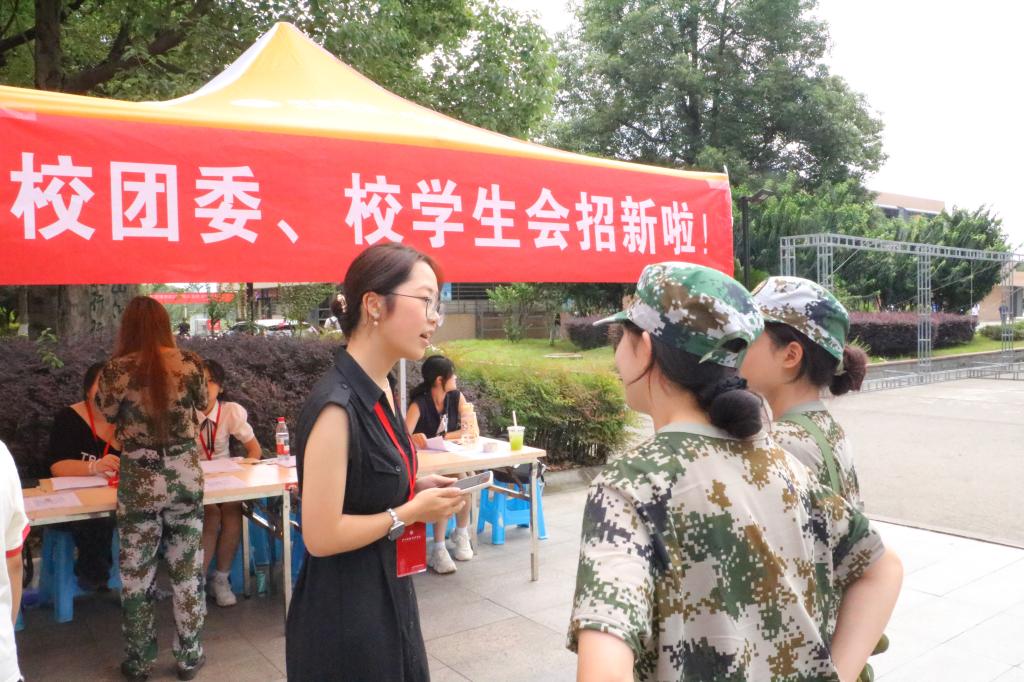 校团委、校学生会各部门学生干部现场答疑,发放招新报名表,介绍本部门工作内容与分工,讲解报名流程。新生们积极咨询,现场报名氛围热烈。
