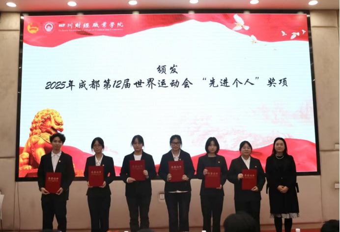 点评环节结束后,大会进入颁奖仪式。党委学生工作部副部长廖中强为2025年暑期“三下乡”社会实践“先进个人”获得者颁发奖项,团委书记、学生工作部副部长高菁为2025年成都第12届世界运动会“先进个人”获得者颁发奖状。
