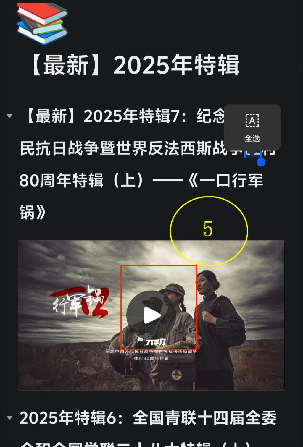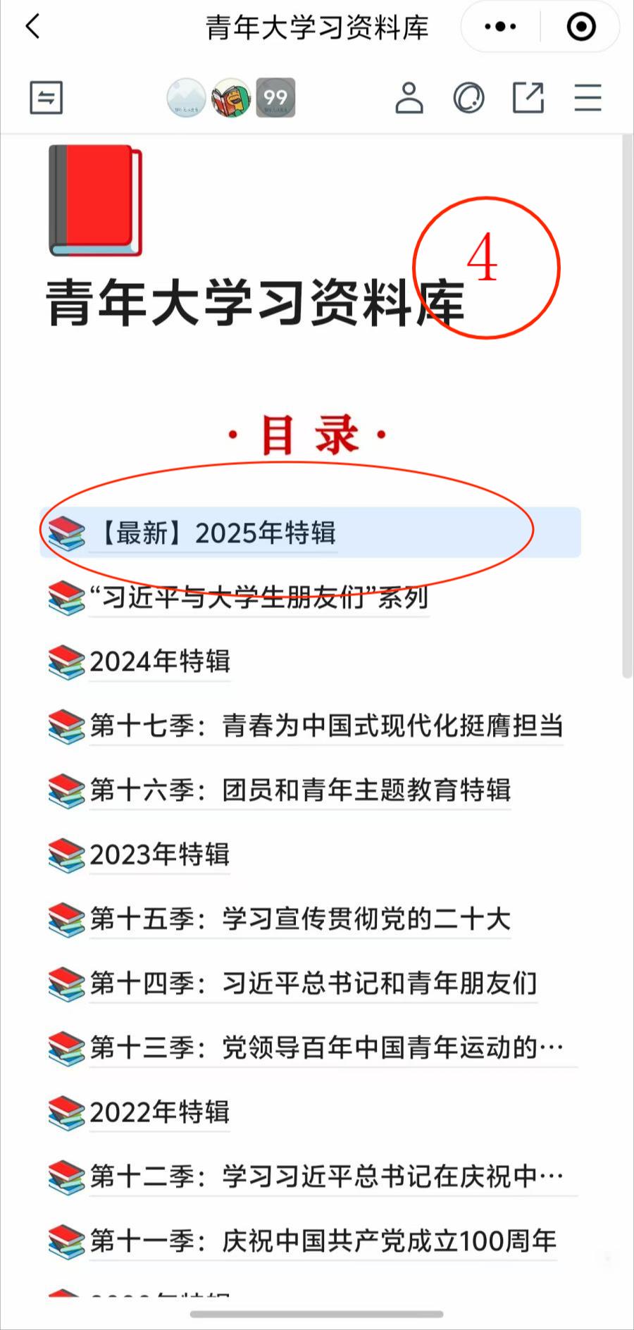 点击——“天府新青年”公众号——青年云——青年大学习——打开腾讯文档——(点允许)选【最新】2025年特辑——选择【最新】一期——点击播放按钮后,将进行播放,下一期更新后同样步骤进行操作。