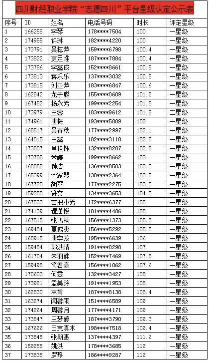 根据《四川青年志愿者星级认定规则(试行)》,我校2025年秋季学期志愿者星级认定完毕,现将最终认定结果公示如下: