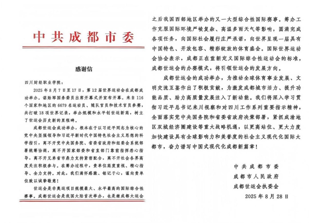 十一、世运征程,青春同行|中共成都市委、成都市人民政府等单位向我校发来感谢信!