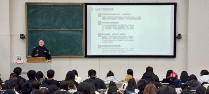 为切实提升我校学生的反诈意识与防范能力,有效遏制校园电信诈骗案件高发态势,10月28日下午,校团委、党委武装部(保卫处)在至诚楼B113教室,面向校级学生骨干、各班级团支书、学习委员及反诈委员,联合举办大学生电信诈骗防范专题讲座。活动特邀龙泉驿区派出所副所长董明同志担任主讲,他以典型案例结合实用技巧的方式,为现场师生带来了一堂生动且深刻的反诈“必修课”。