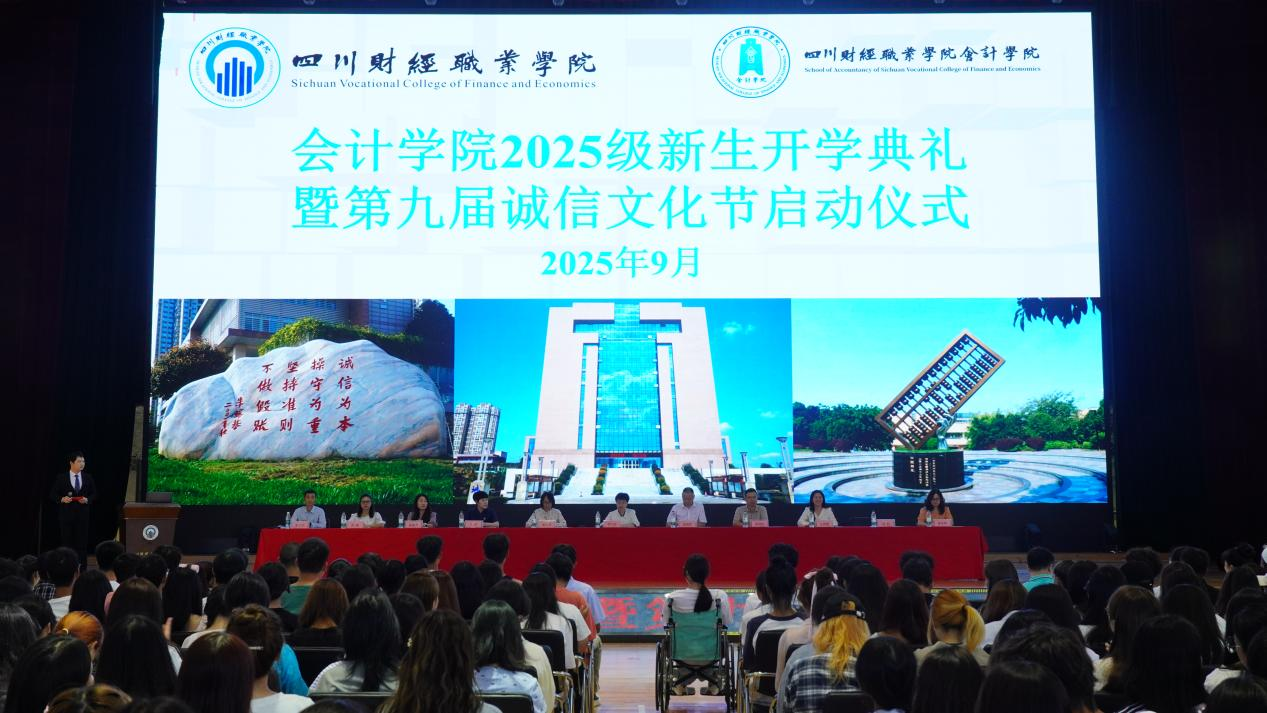 1、会计学院于9月19日下午,在体育馆举行2025级新生开学典礼暨第九届诚信文化节启动仪式,学院领导、教师代表与全体2025级新生参会。仪式中,学院表彰2025年成都世界运动会优秀志愿者,举行新生佩戴院徽仪式,此次典礼庄重热烈,为同学们开启了充满希望的大学生活新篇章。
