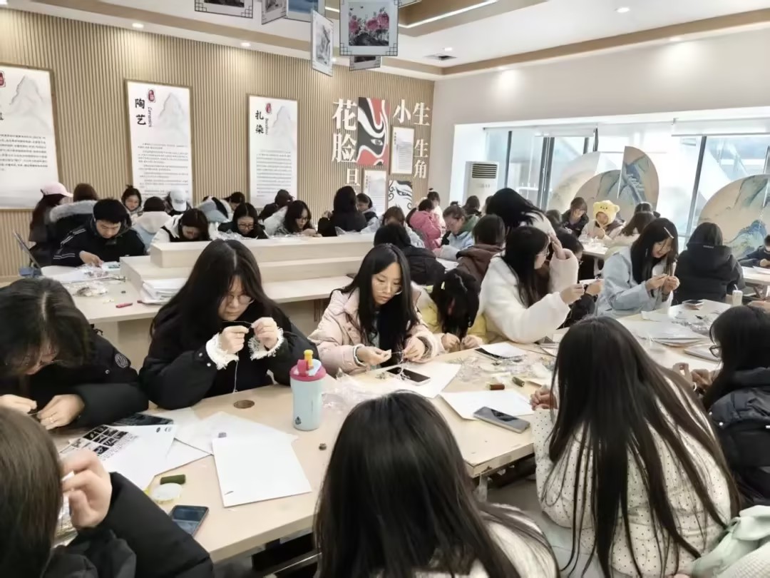 过程中,学员们相互交流技巧、分享心得,遇到难题及时请教,活动现场充满欢声笑语。许多同学第一次接触缠花技艺,看似简单的缠绕却暗藏门道,完成作品的那一刻特别有成就感,也让大家感受到了传统文化的博大精深。进一步加深了同学们对传统技艺的认知。