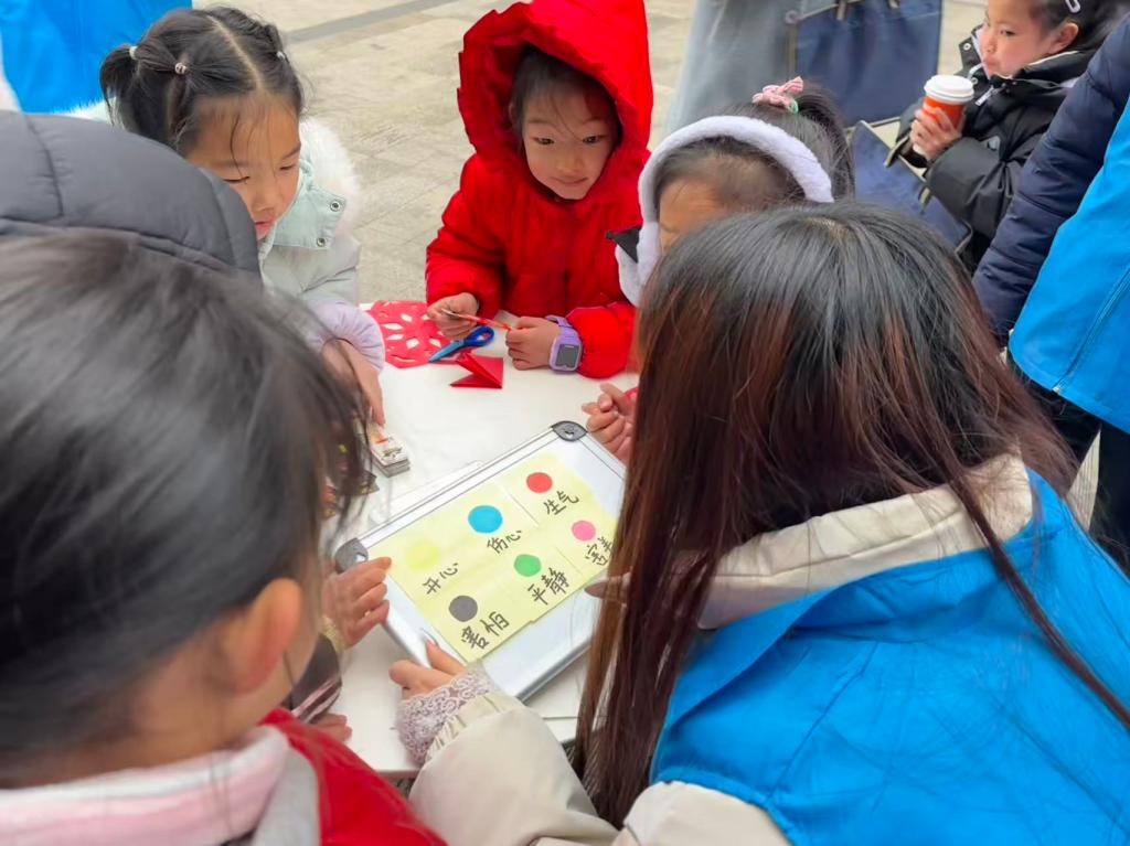 志愿者还带领大家动手裁剪卡纸,制作情绪书签,期间穿插《幸福拍手歌》的轻快旋律,引导孩子们跟着节奏互动,在欢声笑语中舒缓情绪、释放压力。
