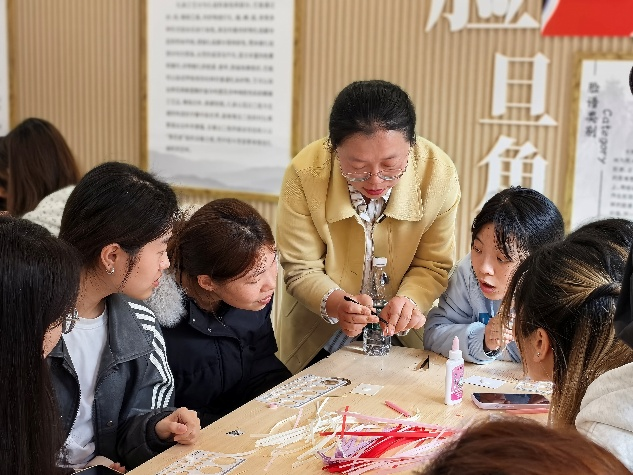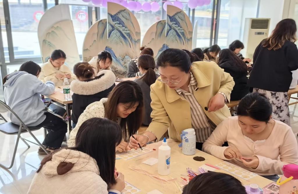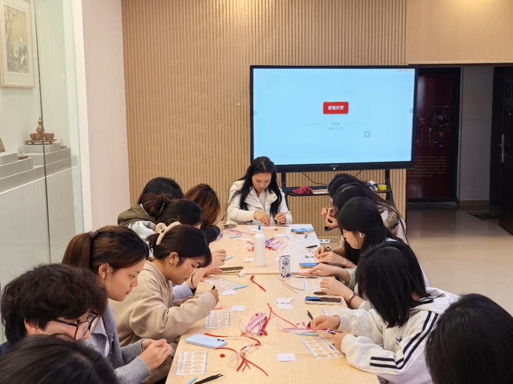 活动中,江老师系统讲解了纸艺历史与技法,从吉祥纹样到空间构造,让同学们读懂非遗底蕴;实操环节里,她手把手指导卷、拼、贴等技巧,带领大家将彩纸变成精致挂件,现场氛围热烈有序。