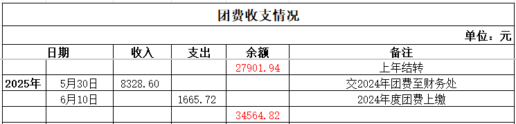 上年结转27901.94元,收缴2024年团费8328.60元,向上级团组织上缴1665.72元,2025年团费结余34564.82元。