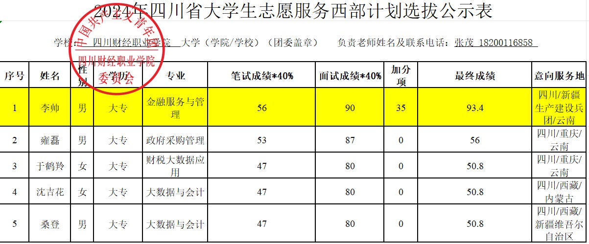 按照《关于印发<2024-2025年度大学生志愿服务西部计划实施方案〉的通知》(中青联发〔2024〕2号)要求,根据2024年四川省大学生志愿服务西部计划工作总体安排,我校项目办组织开展了西部计划志愿者招募选拔工作,经自主报名、资格审查、加分项认定、全省统一机考笔试与学校组织公开面试等环节,现将我校2024年西部计划志愿者招募考试最终成绩进行公示: