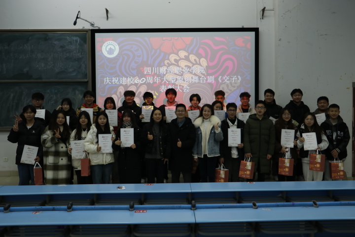 为感谢所有演职人员在长期的训练中付出的辛勤汗水,鼓励更多青年学子投身校园文化建设行列,打造川财校园文化特色品牌,传承和发扬“交子”文化、讲好“交子”故事,校团委于12月19日在至诚楼B113教室召开大型原创舞台剧《交子》表彰大会。党政办公室副主任马宁、团委书记高菁、团委老师朱珠、全体“交子”演职人员参加表彰大会。