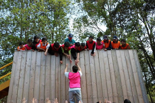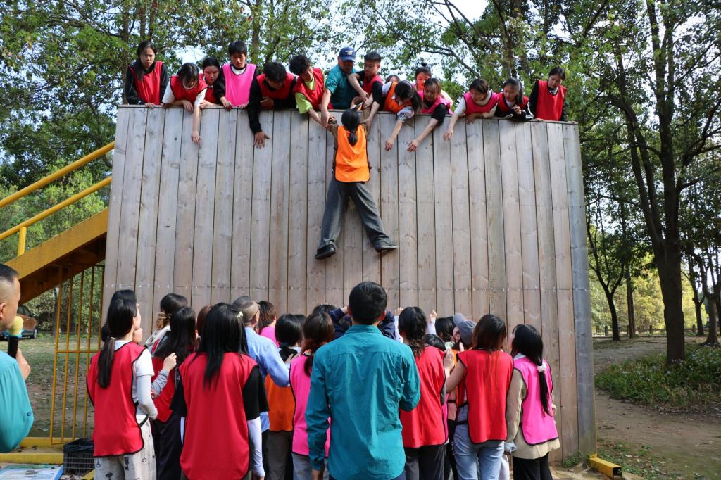 最后,由教练带领的“毕业墙”项目把此次团建活动推向高潮,团队成员要在有限时间内不借助任何外力的情况下,通过相互支持“塔人梯”方式,全体翻过一面高4.2米的垂直墙面。50名学生干部面对高耸的毕业墙,集思广益、克服恐惧、团结一致,实现全员顺利毕业。大家在合作中不时爆发出呼喊声和掌声,也有同学留下了激动地眼泪。