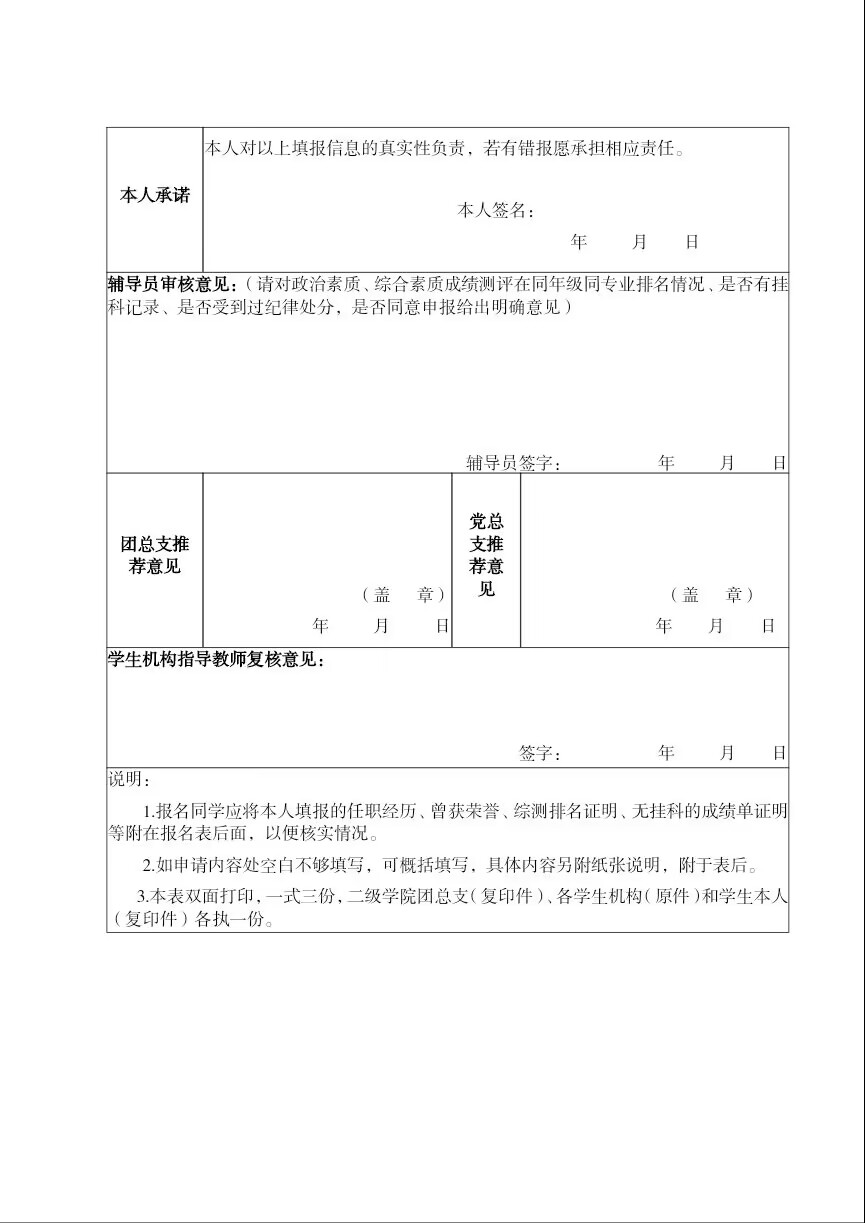 3.校级机构所在部门推荐的,下载并填写《竞聘申请表》以及打印成绩单并由辅导员、二级学院签字确认后将申请表交于所在机构负责人处,由本机构负责人统一收集整理后于6月12日上午10点前交至校团委。