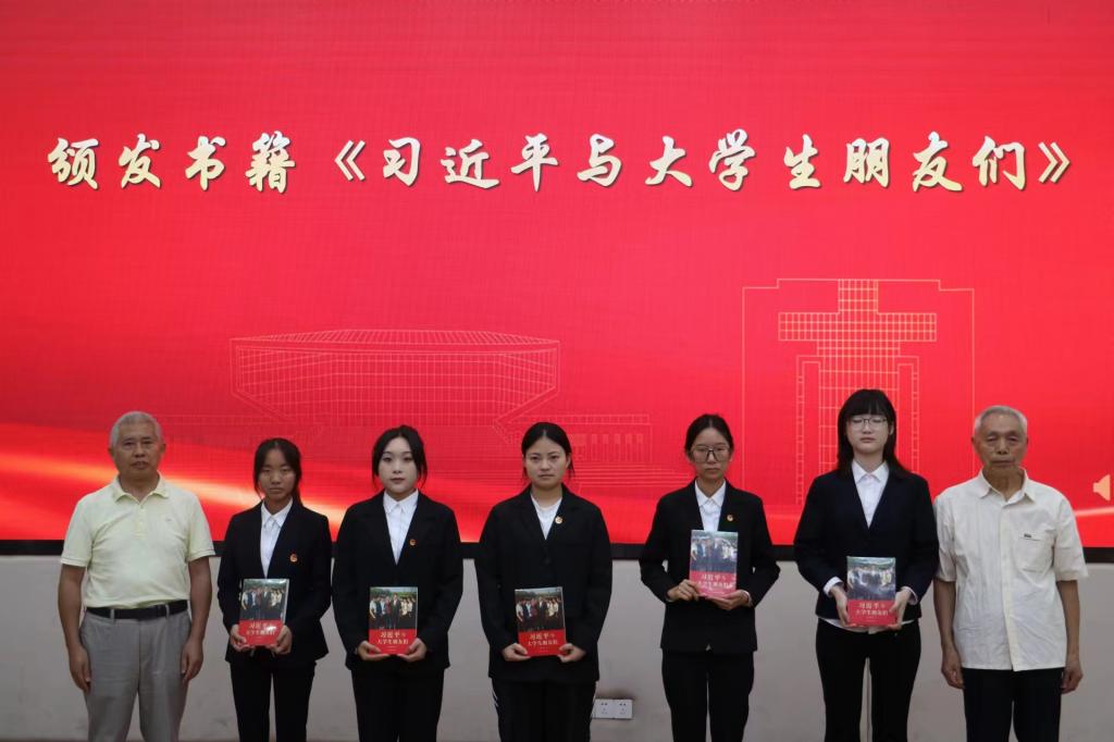 原老财校副校长谈忠厚、原思政部主任左良万为第六期青马班学员代表颁发书籍《习近平与大学生朋友们》
