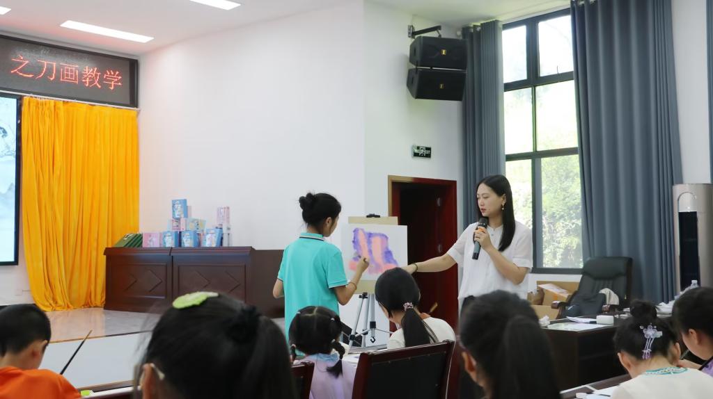 刀画艺术是中华文化中璀璨夺目的明珠,为弘扬中华优秀传统文化,推动非遗文化的发展与传承,实践团成员何莹莹以宣传发扬非遗刀画为核心,为小朋友们讲述刀画的种类、历史、特点以及绘画技巧。小朋友们跟随何莹莹同学的讲解,从调色、勾勒轮廓到上色、刻画细节,通过现场的讲解、理论与实践结合的方式,充分调动小朋友们的积极性,让小朋友们亲自体验到了魅力无限的刀画艺术,在培养小朋友们兴趣的同时,也促进了他们对刀画的了解与热爱。这次活动既是一次艺术的实践,更是一次文化的传承。