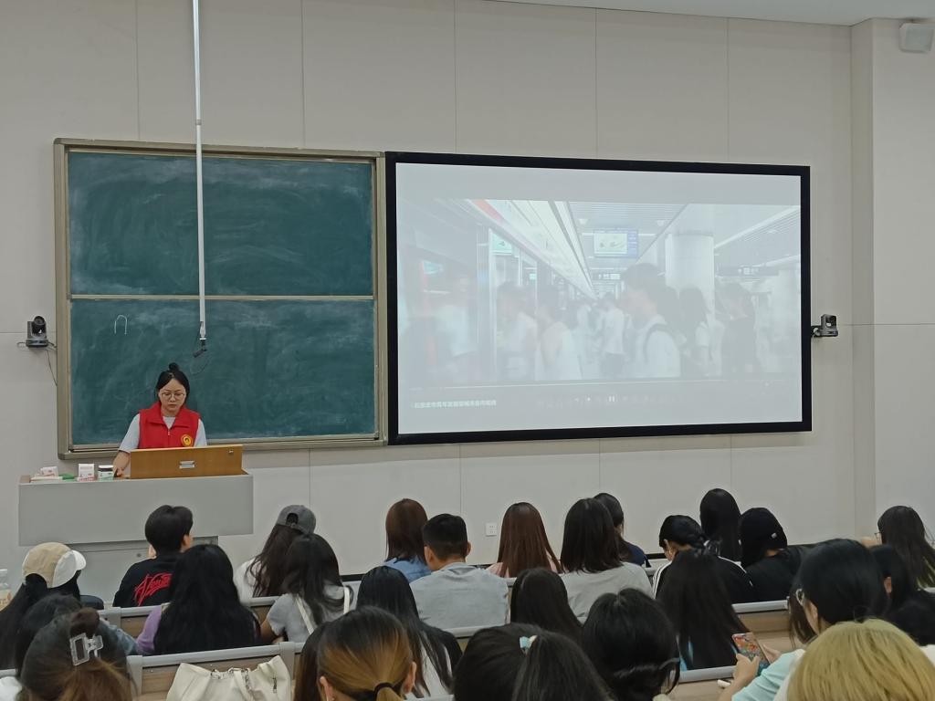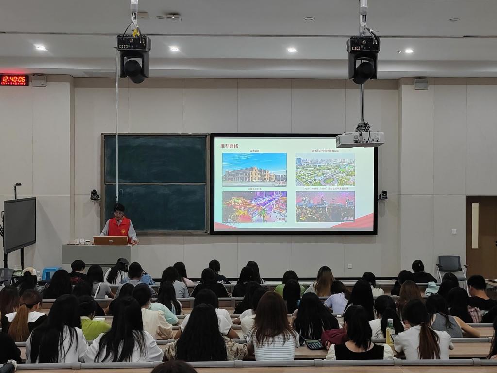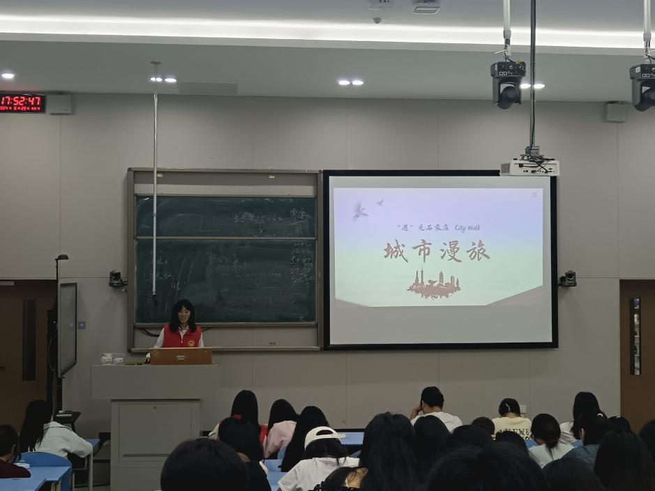 (志愿者带领大家观看石家庄新型城市视频和介绍石家庄实地学习路线)