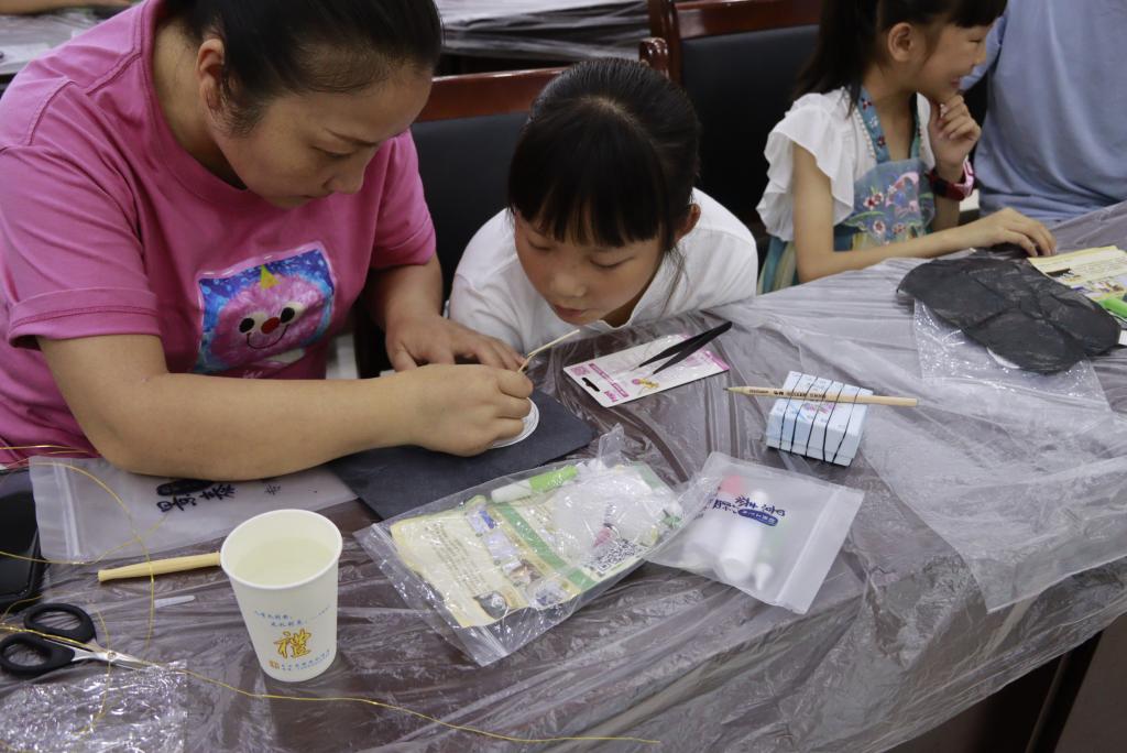 活动过程中,服务队学生负责人汤洁向大家介绍了掐丝珐琅的来历与意义,同时向小朋友们发放制作掐丝珐琅的材料,讲解并示范了从描图、掐丝、点蓝到固沙的每一步制作流程。家长与孩子们纷纷投入到这场手工艺制作的盛宴中,他们或低头细描图案,或精心掐制细丝,或专注点蓝固沙,一根丝、一块板、一滩沙,经由他们之手变成了一个个可爱的掐丝珐琅杯垫。服务团成员也尽心尽力地为小朋友们解疑答惑,及时给予帮助,还有一些服务团同学帮着家长们照顾小孩,现场营造出一种温馨而欢快的氛围。