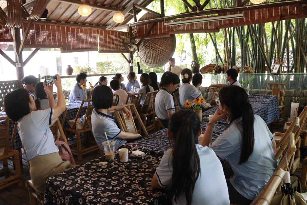 下午两点,实践团师生抵达崇州市竹艺村的遵生小院,体验竹编文化。竹编非遗传承人蔡老师为我们详细讲解了当地竹编的历史,介绍了相关的竹编作品。随后,在非遗传承人的热情讲解下,实践团师生亲手尝试了竹编技艺,从选材、编织到成型,每一个步骤都专心致志。当一把把精美的竹编扇子、一幅幅精致的竹编画在大家手中诞生时,那份成就感与喜悦难以言表。
