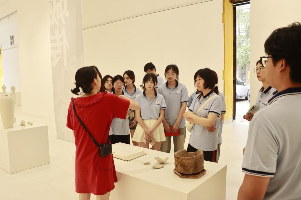 下午,实践团师生继续踏上征程,前往彭州白瓷艺术中心。在展馆内,通过白瓷非遗传承人的详细讲解,我们了解了彭州白瓷的历史渊源、制作工艺以及艺术特色。这里展出的白瓷作品不仅复原了宋代彭州白瓷的原有风貌,还结合了现代审美和实用功能需求进行了创新设计。特别是以熊猫为主题的网红系列产品,如熊猫盖碗、飘逸杯等更是独具特色。跟随传承人的脚步,实践团师生依次参观了白瓷陈列馆、白瓷艺术馆、彭州窑、白瓷制作车间,在参观车间时,“守艺、传艺、创艺”六个大字悬挂于梁顶,让实践团师生深刻体会到优秀传统文化要时刻保持守根、传承和创新