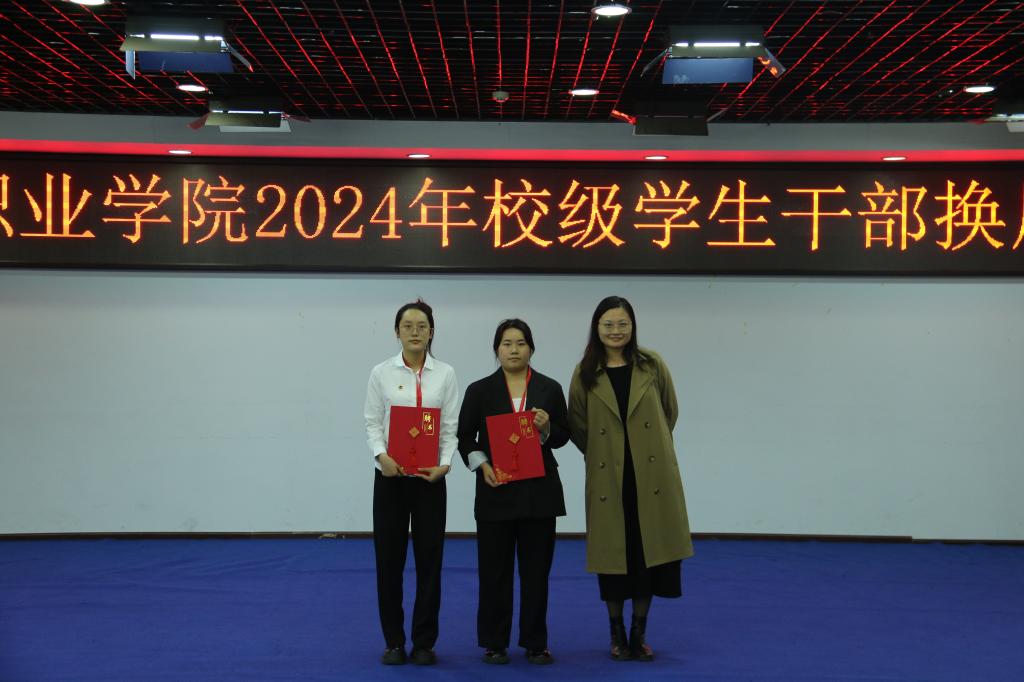 (团委指导老师魏雅婷、张茂为学生干部颁发聘书)