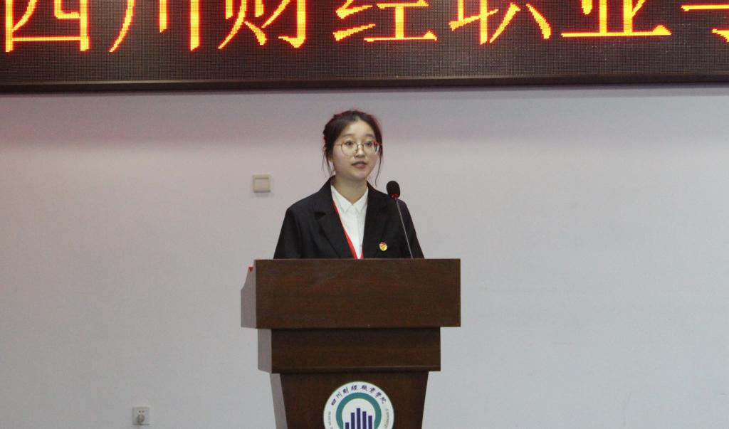 第十九届学生干部代表周圆圆上台发言。她对自己以及新一届学生干部未来的工作提出了三点规划:第一,以学促勤提升素质;第二,勇于担当,狠抓落实;第三,凝心聚力,团结协作。
