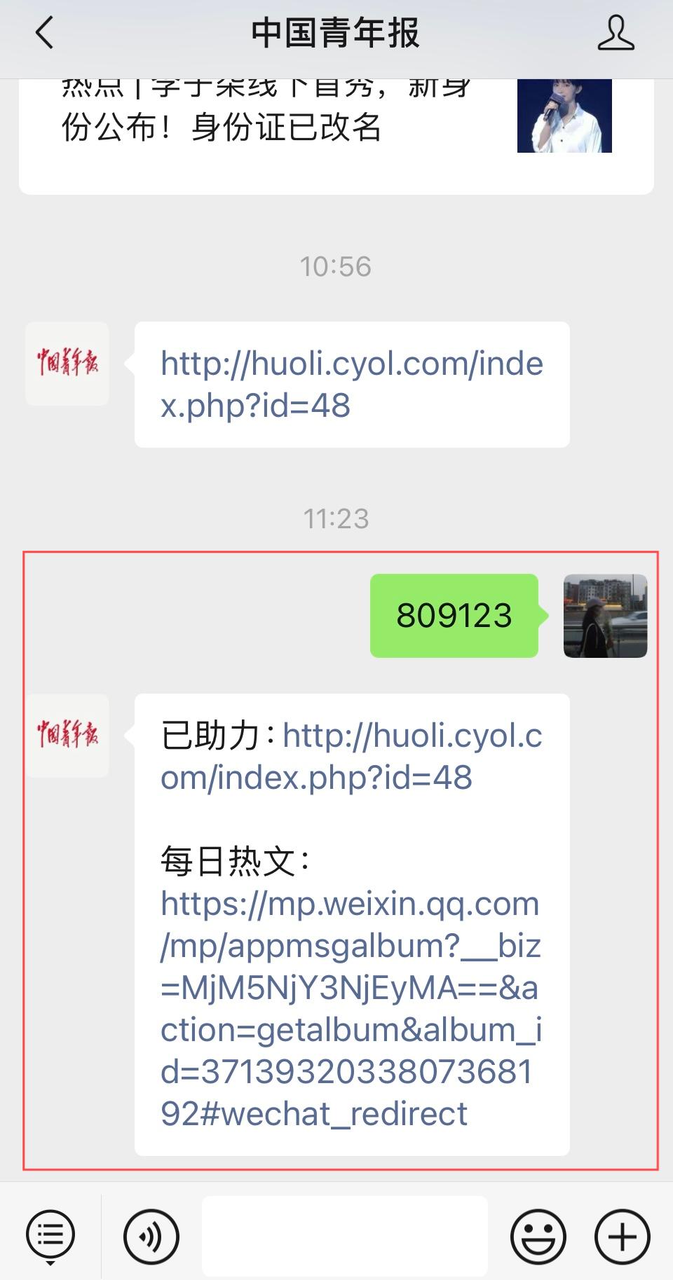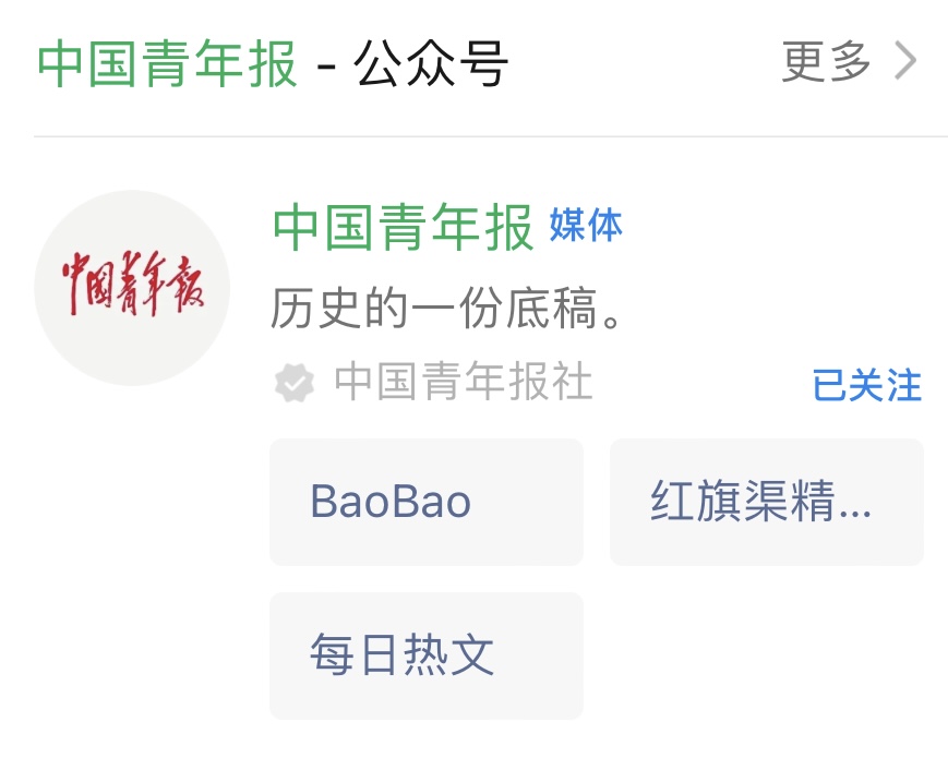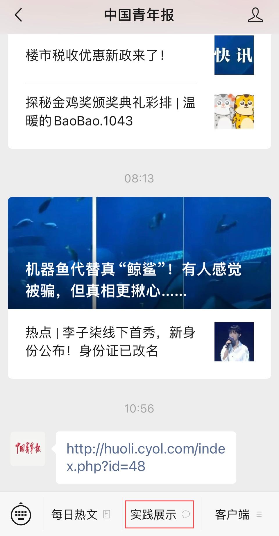 “中国青年报”公众号和“中国青年报”客户端同时进行展示。