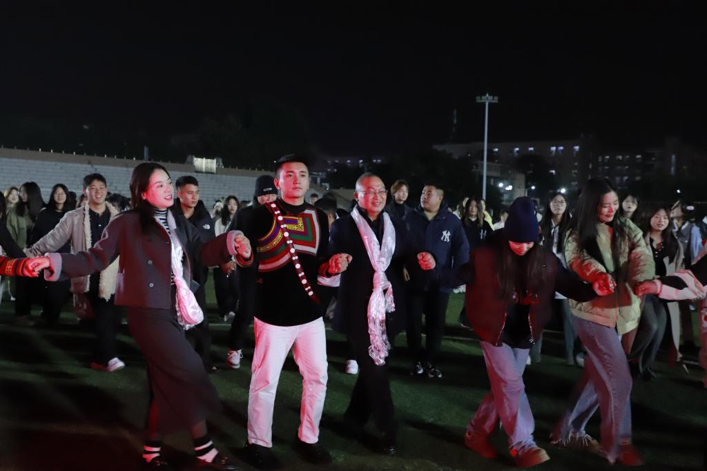 当晚,各民族师生一起参加了“火舞川财”篝火晚会,师生们伴随着欢快的彝族达体舞和藏族锅庄舞音乐,手牵手围着火堆尽情舞蹈。