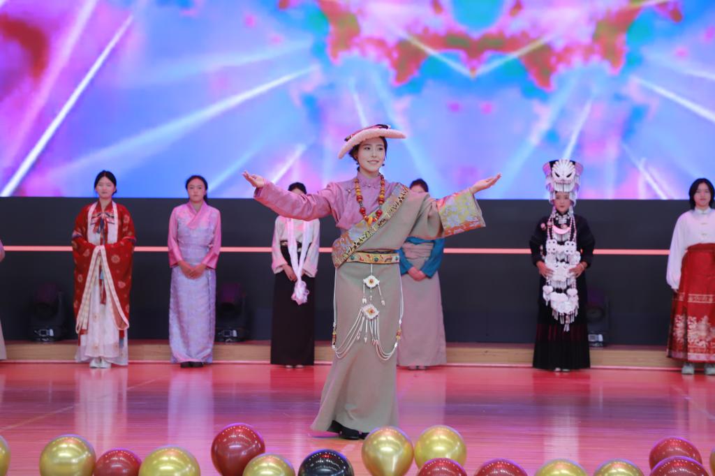 在“民族之花选拔赛”中,各民族各美其美、美美与共,以树立一族一花的优秀代表为榜样,展现大学生的青春风采。经过前期的报名和初选,最终9名选手进入决赛。决赛现场,选手们身着精美的汉服、藏装和彝族服装等传统服饰,通过走秀、自我介绍、才艺展示等环节,各显其能、各尽其美。