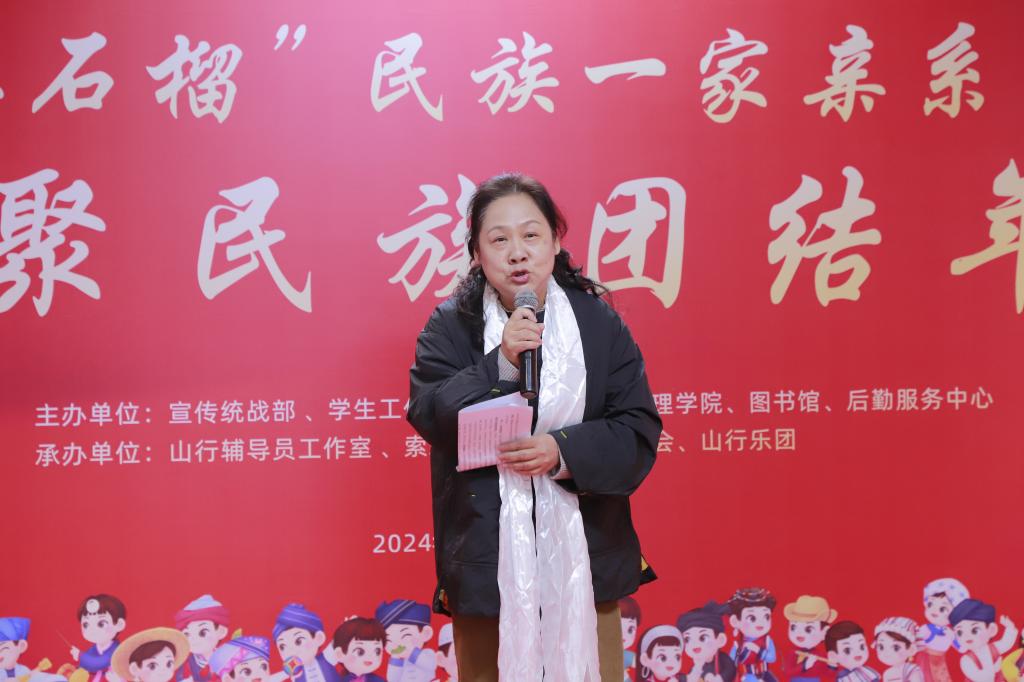 在欢聚民族团结年活动现场,张华代表学院党委给师生们带来了民族团结年的祝福。她讲到,学院长期以来以铸牢中华民族共同体意识为主线,在教育教学过程中抓实民族团结进步教育工作,在全校师生中常态化开展民族团结你我同创、美好校园大家共享的活动,人人争做民族团结模范,处处盛开民族团结之花。