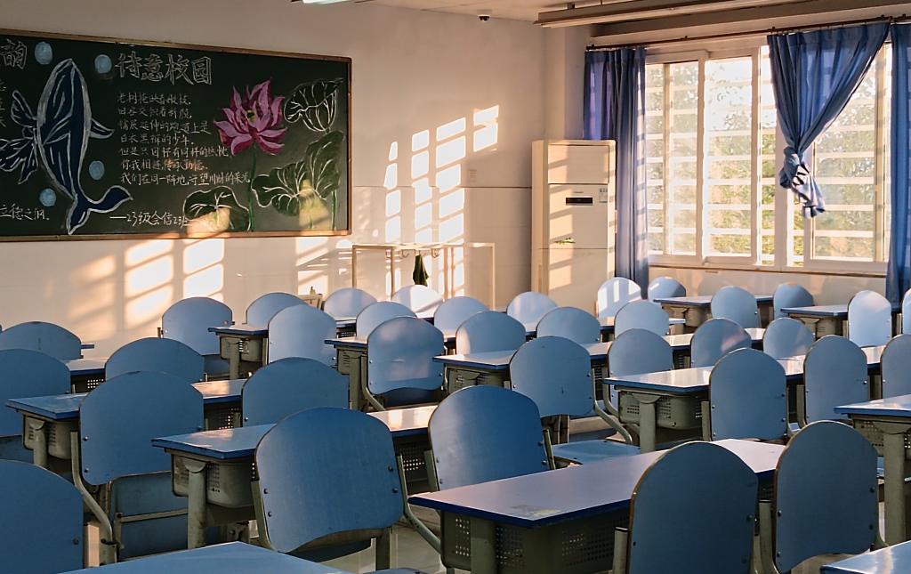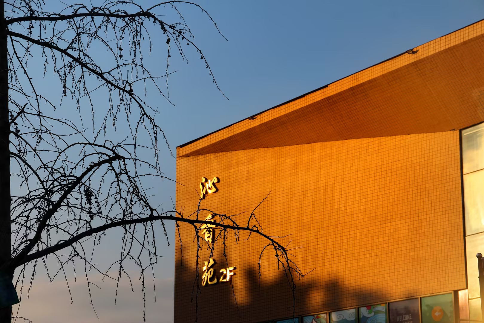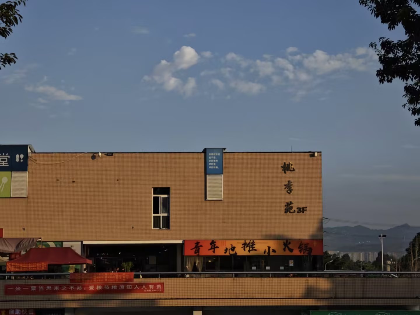 夕阳将暖橙色的余晖倾洒在食堂的外墙上