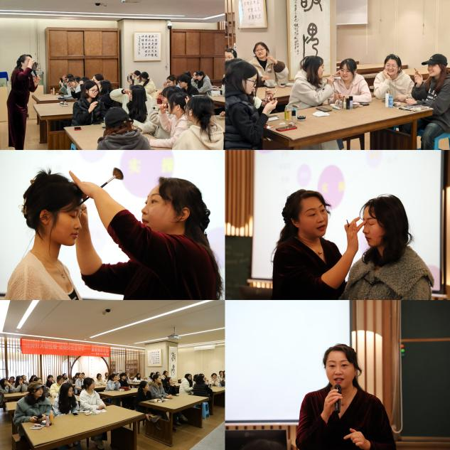 “焕彩芳华 悦纳自己”美妆素养讲座在非遗教室顺利开讲,学校特邀专业美妆讲师姚晴现场授课,为师生带来实用的美学知识分享。讲座围绕科学护肤、日常妆容打造两大核心展开,讲师以“现场示范+同步跟练+一对一答疑”的沉浸式模式,拆解新手易上手的化妆技巧,细致讲解不同肤质的护肤要点与眼妆实用画法。授课过程中,讲师更传递出“悦纳自我、不盲从潮流”的审美理念,引导在场师生在提升外在形象的同时,提升了由内而外的自信,现场互动频繁,氛围热烈融洽。