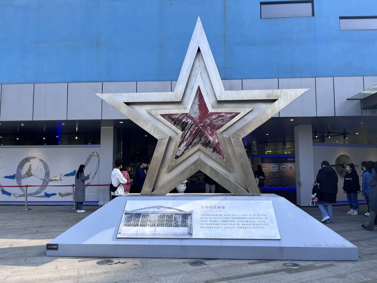成飞航空主题教育基地的门口有一颗巨大的五角星——“心中的五角星”。这枚五角星来自成飞建厂时首批厂房之一——50#厂房。它默默注视着一代代战机腾空而起,见证着一代代航空航天背后的“无名英雄”为中国航空的发展的不懈奋斗,这些都是激情奋斗岁月的红色记忆中最“闪亮”的标志。