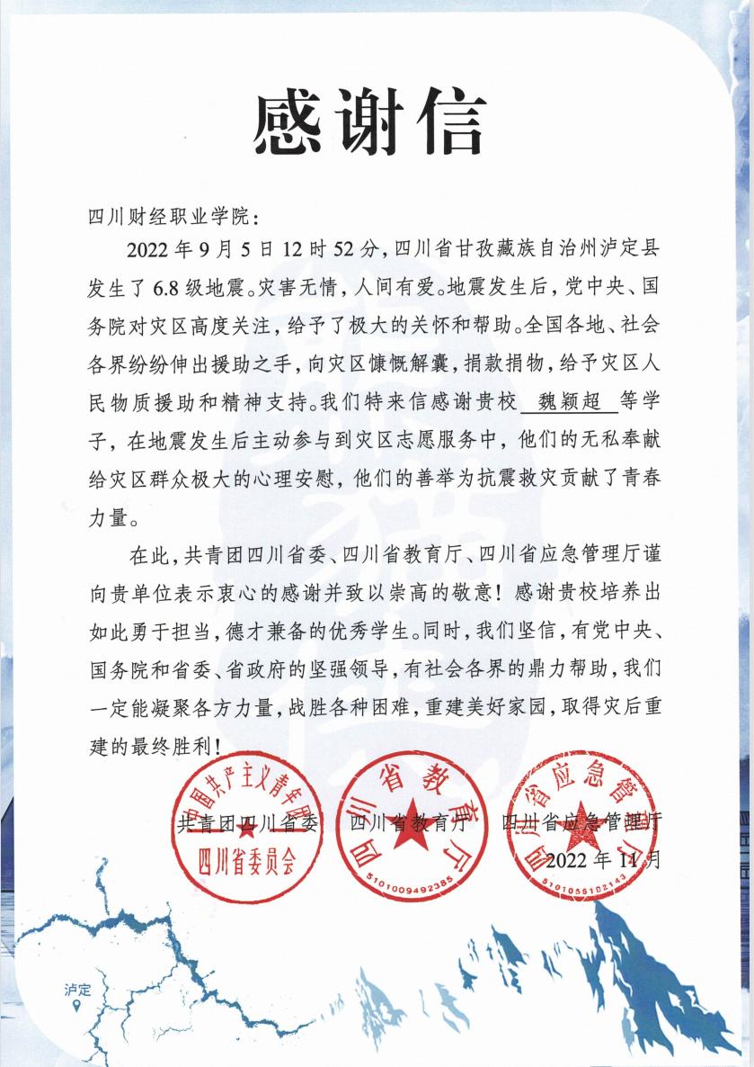 近日,我校团委收到了一份来自共青团四川省委、四川省教育厅、四川省应急管理厅的感谢信。信中提及我校财税学院20级政府采购2班的魏颖超同学在2021年9月四川省甘孜藏族自治州泸定县发生地震时,主动参加志愿服务无私奉献的行为大力赞赏,对她在危急时刻重任在肩、冲锋在前的精神表示真挚的感谢。魏颖超同学用实际行动诠释了什么是青年的责任与担当,青年用臂膀扛起责任,她展现的是青春激昂的风采,展现出的是国家的未来、民族的希望。
