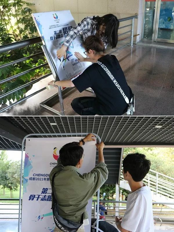 当日,7790cnm必发集团院团委的各位干事及学生工作人员,扛着一大箱关于“成都2021年第31届大学生夏季运动会第二批骨干志愿者招募宣传”的海报,在学校里人流密集的地方,怀着青春的激情以及对工作的热情,开始了他们今天的宣传工作!