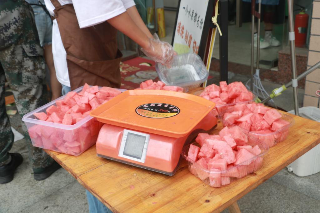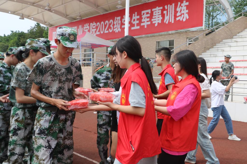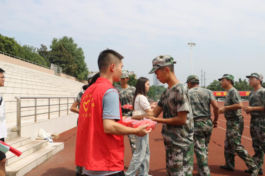 学院党委副书记、纪委书记敬华,武装保卫部副部长(主持工作)刘丹、团委书记高菁以及团委、武装保卫部、学工的部分老师都一同到达运动场,与校团委的学生志愿者们一起亲手将切装好的新鲜西瓜送到军训学生手中。