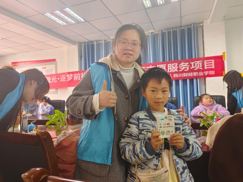 志愿者王玲华和唐丽虹两名同学通过一问一答的形式向小朋友们展示了“零花钱去哪了?”,引出手账,最后,所有志愿者一对一指导小朋动手制作理财手账本。一本本充满童真的手账本记录着属于小朋友们的纯真童年,一颗颗理财的种子在他们心中生根发芽。